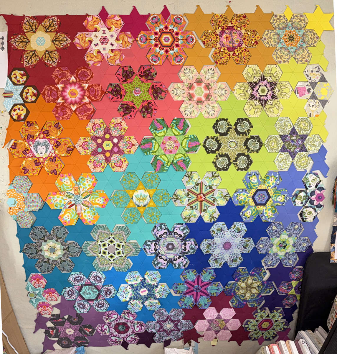 And yes, indeed! All of the blooms are now complete. It’s time to begin sewing them all together with the stars. This is a very long-term project, that I can only sew a little at a time, but I’m hoping to spend a little time each week on it so I can make progress.
