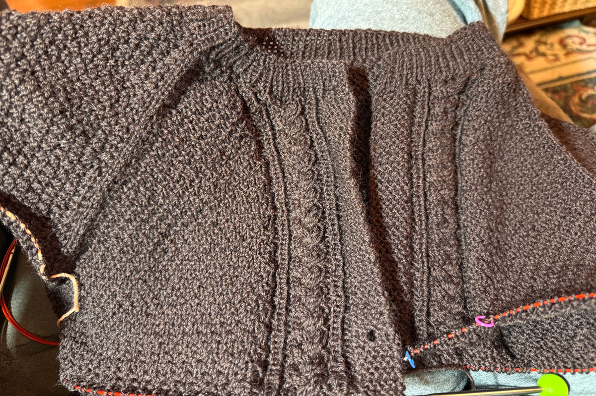Now that I’ve split for the sleeves on this project, the body is fairly straightforward. I just need to remember to place buttonholes in the correct places as I go. While it’s not as simple as garter stitch, it is still quite relaxing, and I’ve memorized the cables and stitch repeats. Each repeat is 4… Continue reading A little bit of body